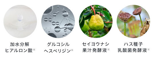 加水分解ヒアルロン酸とグル粉知るヘスペリジン、セイヨウナシ果汁発酵液、ハス種子乳酸菌発酵液を配合しています。