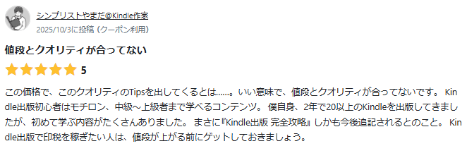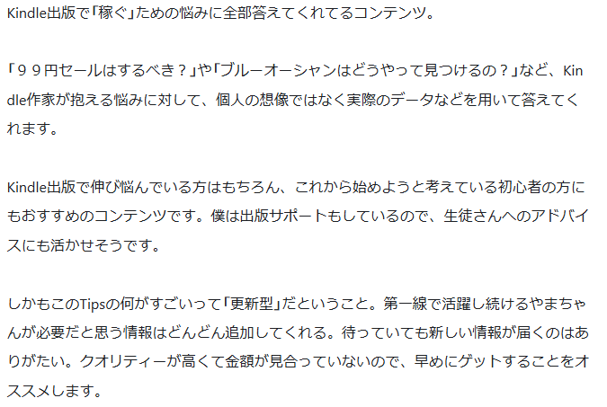 この教材には、Kindle出版の初心者から中級者が次のステージへ進むために必要な知識とノウハウが凝縮されています。