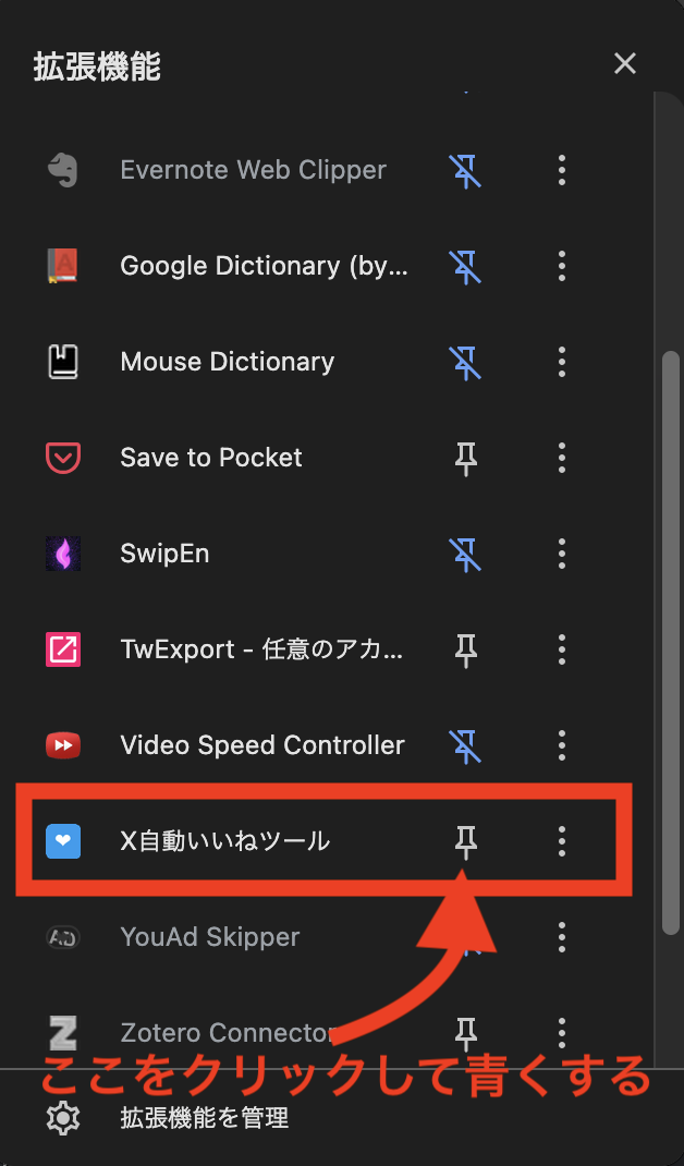 表示されるメニューの中から、自動いいねツールのアイコンの右隣にあるピンマークをクリックして表示させる。